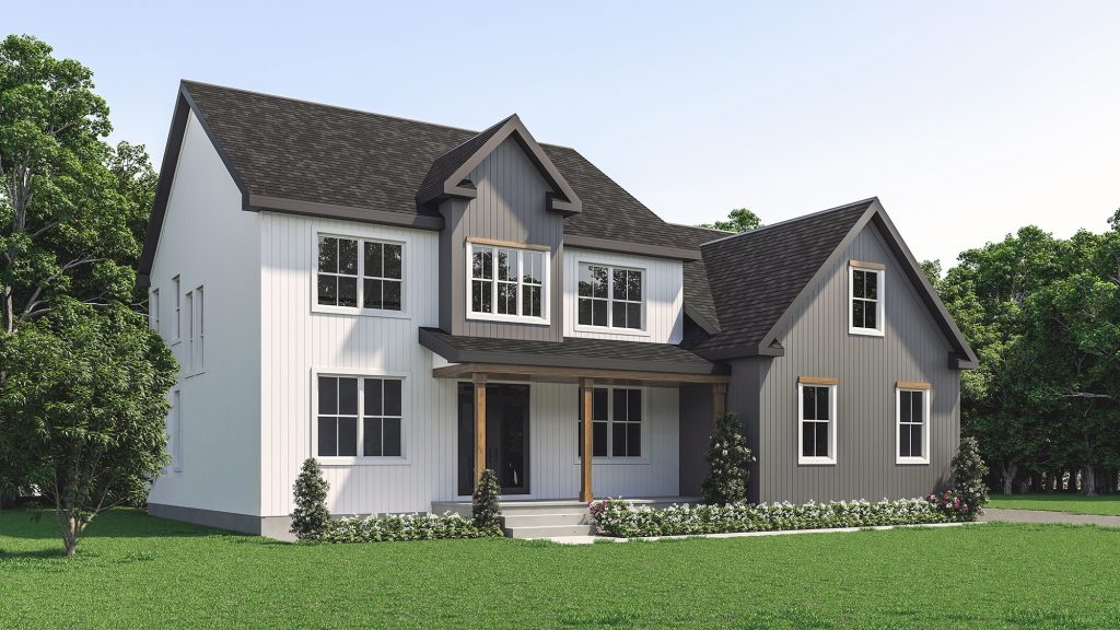 • Modern, two-tone color scheme in board and batten with cedar accents on front of home